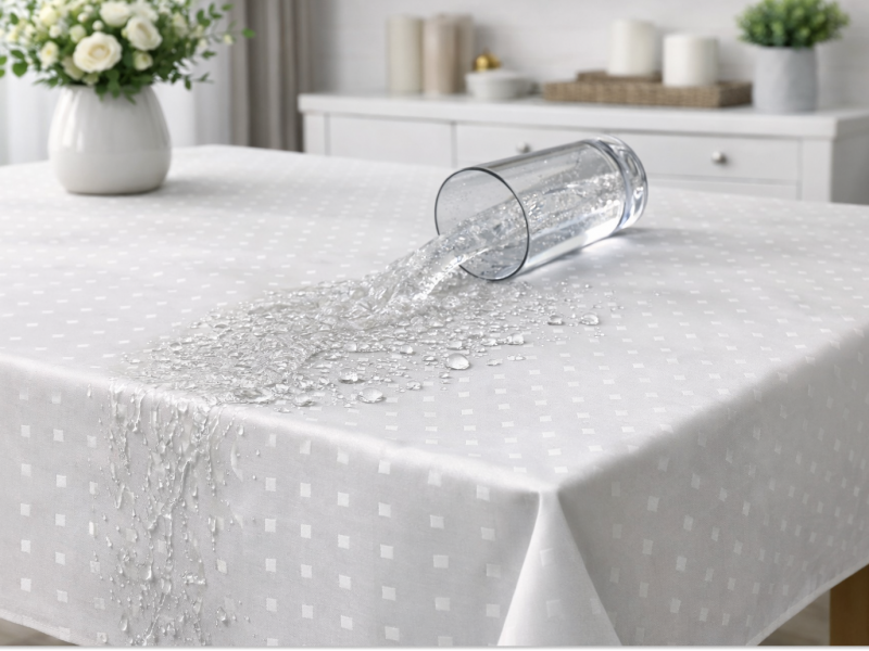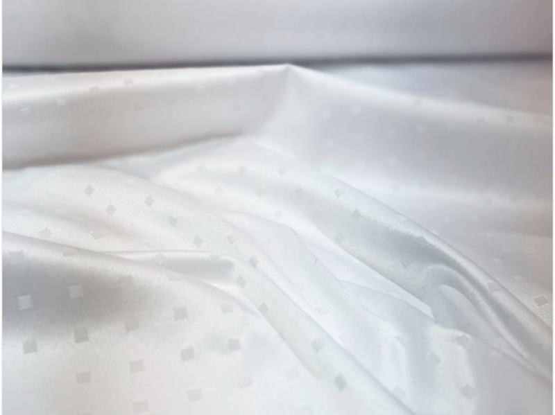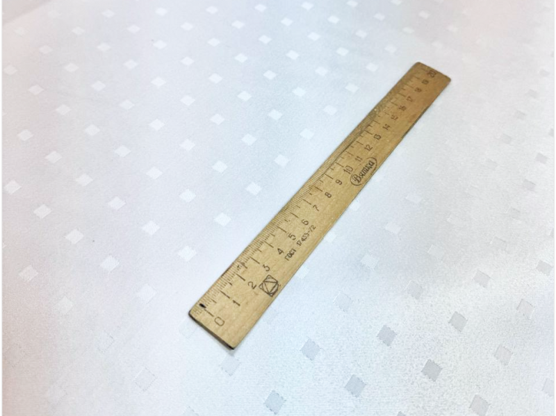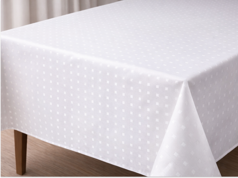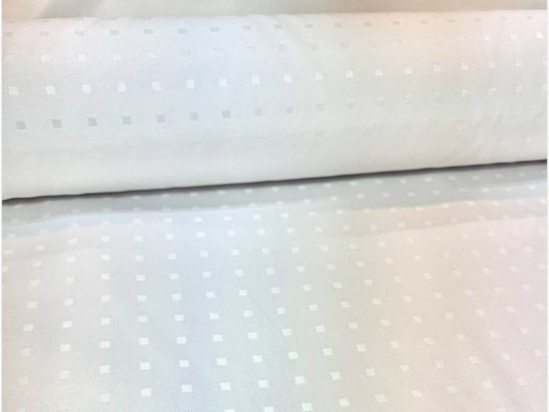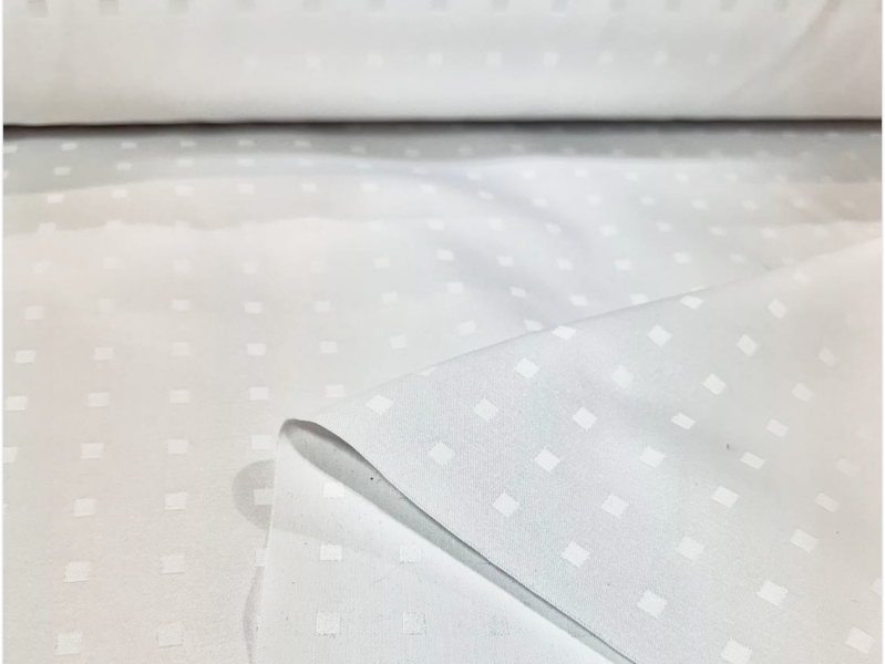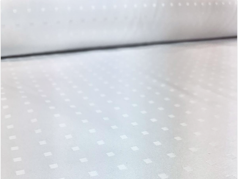 Скатертная ткань белого цвета с рисунком маленьких квадратов расположенных семметрично друг к другу. Сторона квадратика - 0.5 см, расстояние между квадратиками - 2 см. Ткань изготовлена из смесовой ткани, в составе которой хлопок и полиэфир, также на ткань нанесена ГрязеВодоМаслоотталкивающая пропитка.