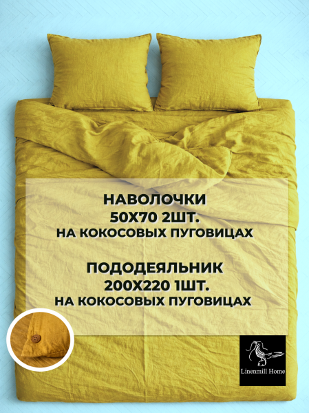 В набор входят один пододеяльник 200х220 на кокосовых пуговках и две наволочки 50х70 на кокосовых пуговках.
