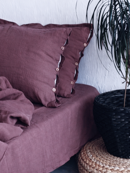 Цвет бургунди (винный) является насыщенным, глубоким оттенком с благородным подтоном, который создаёт ощущение тепла и «бутик-отельной» эстетики в спальне. На матовой льняной фактуре винный цвет выглядит особенно выразительно: не глянцево, а мягко и дорого, подчёркивая натуральность материала и рельеф переплетения. Этот оттенок делает интерьер более уютным и статусным, хорошо сочетается с бежевыми, молочными, серыми и древесными тонами, а также с тёплым освещением. Бургунди особенно эффектен как подарочный вариант: цвет ассоциируется с торжественностью и вниманием к деталям.