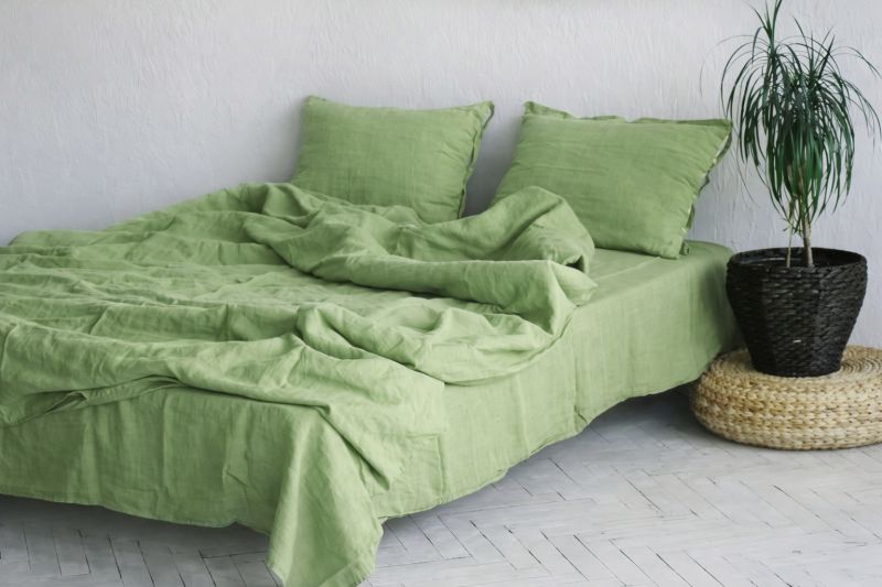 Зелёный комплект выделяется природным, спокойным оттенком, который усиливает ощущение натуральности льна и создаёт в спальне расслабляющую атмосферу. Цвет ассоциируется с свежестью и балансом, визуально «успокаивает» пространство и хорошо подходит для отдыха.