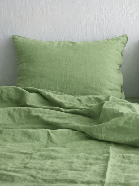На матовой льняной поверхности зелёный выглядит особенно живо и глубоко: фактура ткани делает оттенок объёмнее и подчёркивает природную эстетику комплекта вместе с кокосовыми пуговицами. Зелёный легко сочетается с белыми, бежевыми, серыми и древесными тонами, а также с интерьером в эко-стиле, сканди и минимализме.