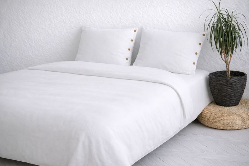 Евро-комплект белого цвета из смесовой ткани (лен/хлопок). Экологичный и очень приятный во всех отношениях- такой комплект белья будет прекрасным подарком на льняную свадьбу.