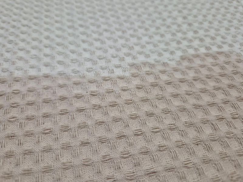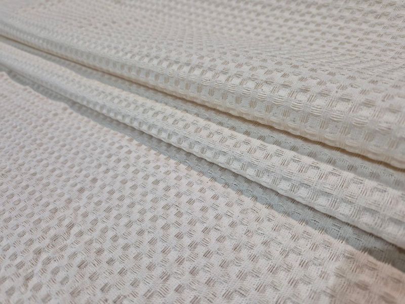 Хлопковая ткань бежевого цвета- идеально подойдёт для изготовления халатов, полотенец, других предметов для ванной комнаты. Можно сшить разнообразные предметы для отеля, хостела, гостевого дома. Материал прочный, приятный на ощупь. При стирке дает усадку- около 10%. Размер клеточки 0.8*1 см, после стирки фактура ткани становится рельефной, клеточки уменьшаются и ткань выглядит более объемной.
