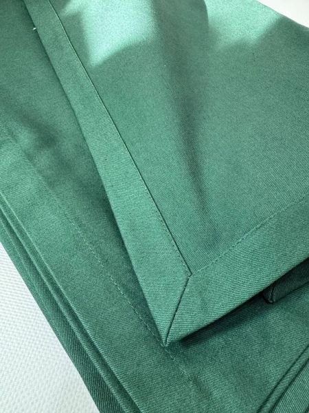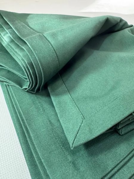 Зелёная скатерть из натурального хлопка для стола до полутора метров, например такая скатерть подойдёт для большинства столов в квартирах. Плотная натуральная ткань создаст ощущение торжества. Скатерть украшена декоративным подкладом по краю.