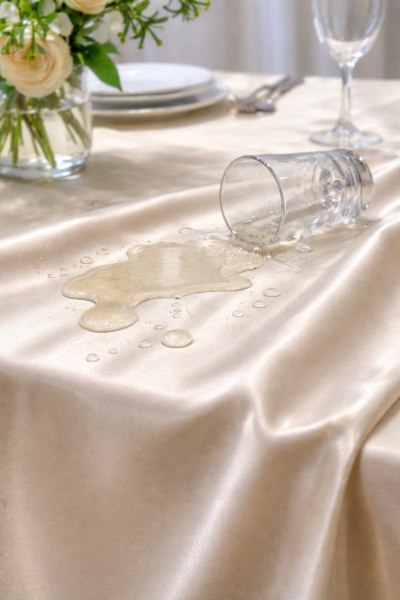 Широкая профессиональная скатертная ткань бежевого цвета с грязеотталкивающей отделкой. Можно сшить большую скатерть на банкетный стол. Широкие скатерти - вот для чего предназначена эта ткань.